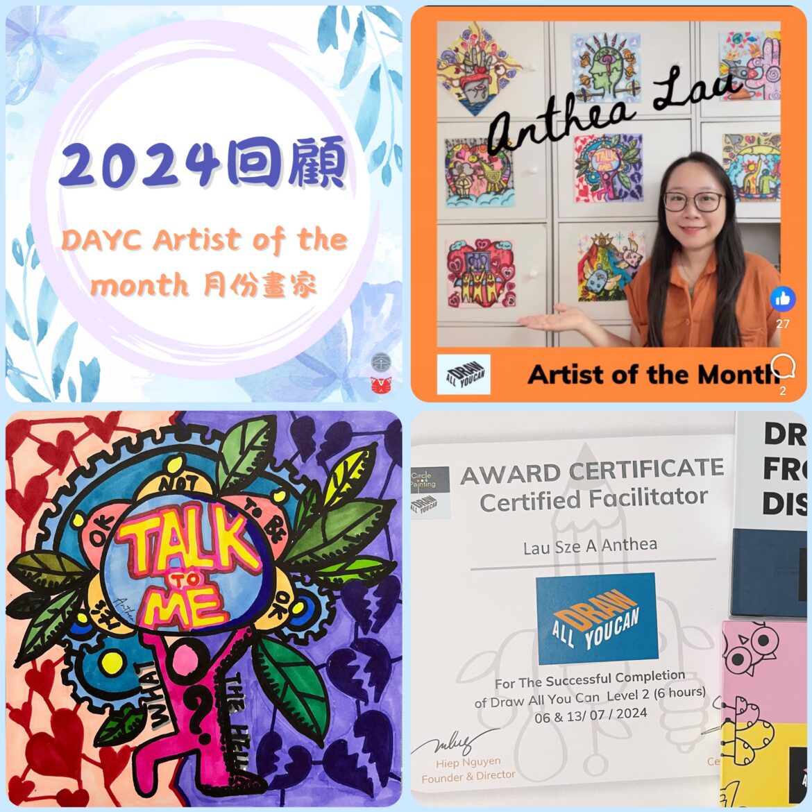 心靈尋寶藝術療癒 2024回顧-DAYC Artist of the month 月份畫家 by Anthea 2 1 月, 2025 喜歡文字的 Anthea 我很喜歡藝術,很喜歡畫畫,也很喜歡身心靈療癒。 於是,我決定將我喜歡的事情,結合在一起,成為「正念藝術能量療癒師」。在藝術中正念,在藝術中療癒,在藝術中得到美好生活的能量,跟別人分享我的能量,為別人提供藝術療癒的價值。 Continue Reading 2 1 月, 2025 0 感謝你們的分享 0 FacebookWhatsappEmail